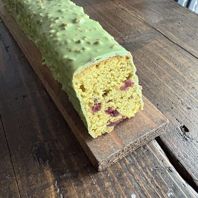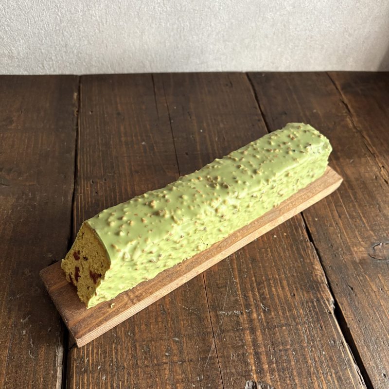 ピスタチオのチョコレートをコーティングし、カットした時の鮮やかなピタチオの緑とほのかなクランベリーの酸味が心地よい一品です