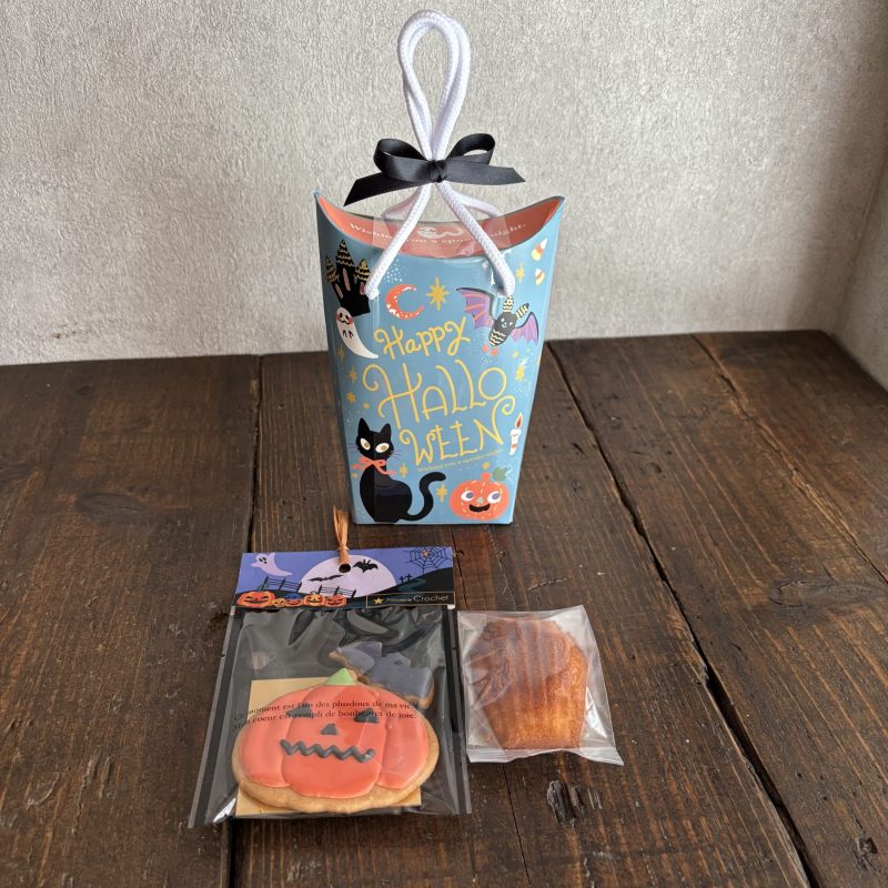 ハロウィンらしいバッグタイプの袋に、ハロウィンアイシングクッキー、マドレーヌが入っています