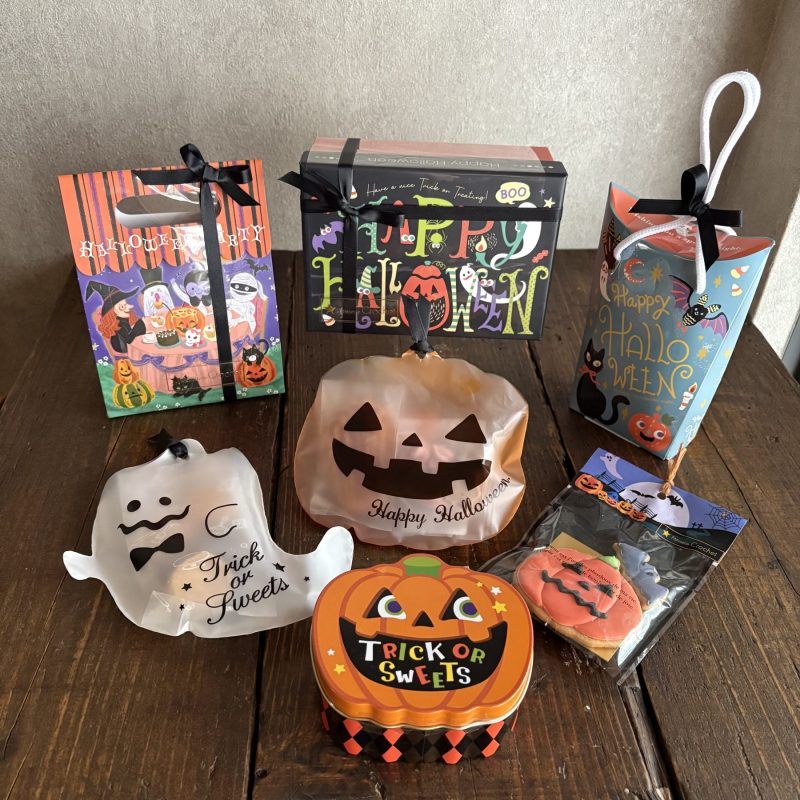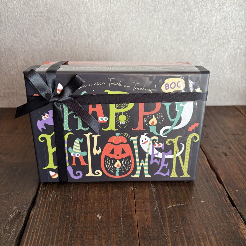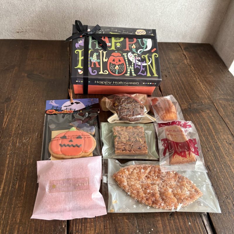 ハロウィンらしいカラフルな箱に、ハロウィンアイシングクッキー、マドレーヌ、クロシェのブラウニー、フロランタンオランジュ、喜界島白黒糖のフィナンシェ、リーフパイ、いちごのブールネージュが入っています