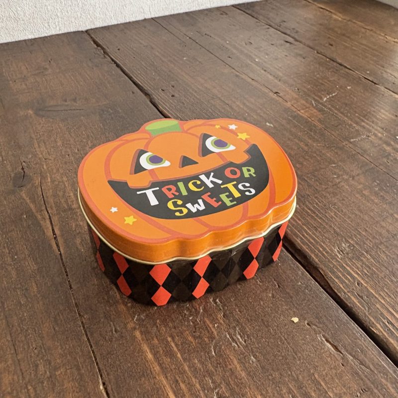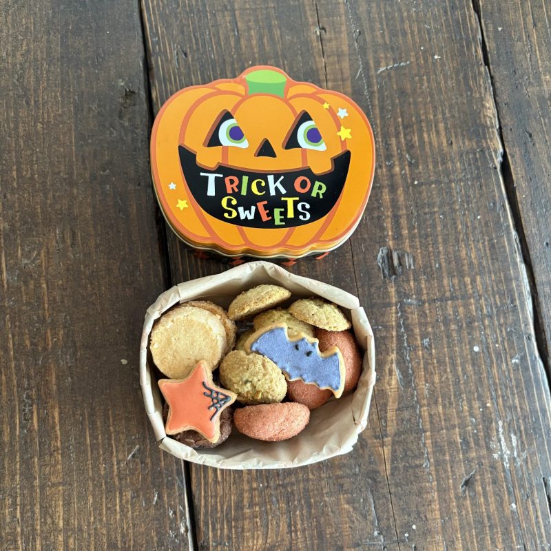 ハロウィンらしいブリキの小さな缶に、クロシェ人気のクッキーとハロウィンのアイシングクッキーが入っています